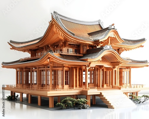Fototapeta premium Majestic Traditional Japanese Pagoda with Curved Roofs and Ornate Wooden Architecture on White Background