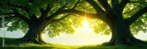 Fototapeta premium Majestic tree archway with sunlight filtering through leaves and foliage, leafy, branches, leaf