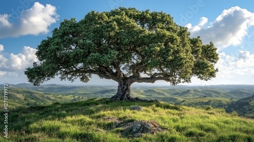 Obraz premium Majestic tree atop hill, scenic landscape, sunny day
