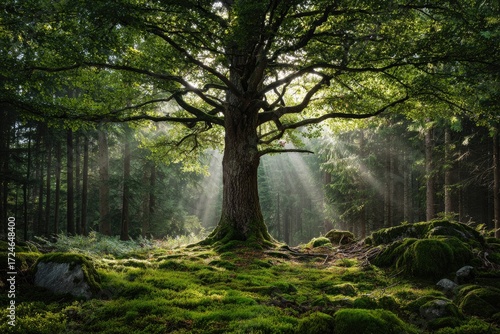 Fototapeta premium Majestic tree in sunlit forest