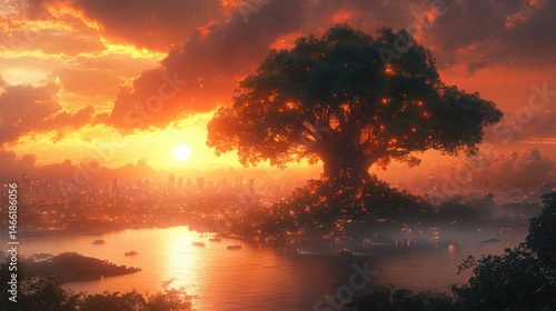 Naklejka premium Majestic tree overlooking a city at sunset, serene waters surrounding