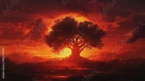 © Holo Frame, Fototapeta premium Majestic tree silhouette against a vibrant sunset representing the cycle of life and death in nature's beauty