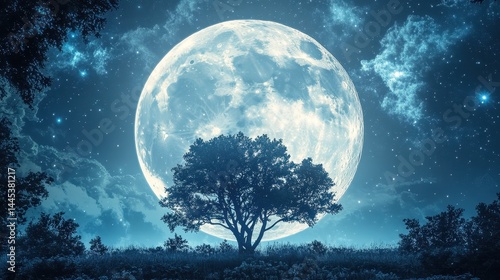 © Степан Озарчук, Naklejka premium Majestic tree silhouette against enormous full moon in starry night sky