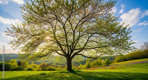 © Nia, Fototapeta premium Majestic tree stands tall in a vibrant green landscape under a bright sky.