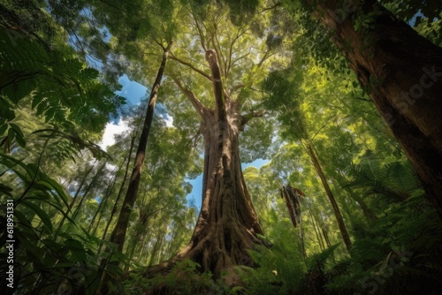 © Alfazet Chronicles, Naklejka premium majestic tree surrounded by towering forest canopy, with a glimpse of the blue sky above, created with generative ai