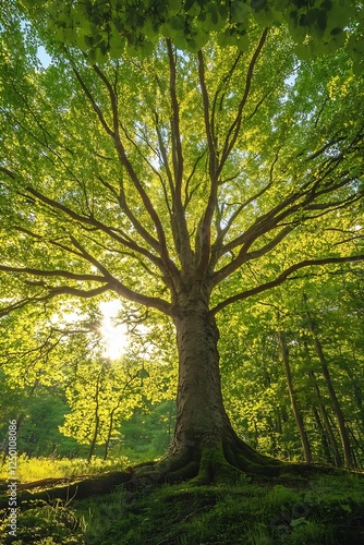 Fototapeta premium Majestic tree towering in lush forest with sunlight filtering through green...