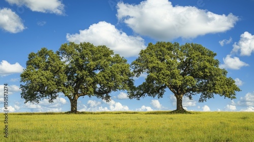 © Yeivaz, Obraz premium Majestic Trees in a Golden Field Under a Cloud-Kissed Sky