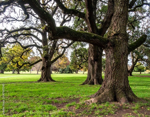 © Tuachan, Obraz premium Majestic Trees with Textured Bark in a Lush Green Field