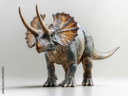 © INFORMAN, Obraz premium Majestic Triceratops on Display in a Studio Setting with Vibrant Lighting and Detailed Features