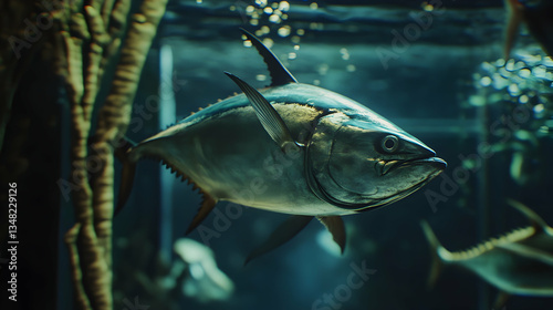 © Swaha, Fototapeta premium Majestic tuna gracefully swims in a deep ocean aquarium, showcasing its powerful form and sleek lines.