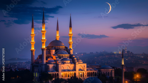© FantasticPixel, Obraz premium Majestic Twilight View of an Illuminated Mosque with Crescent Moon
