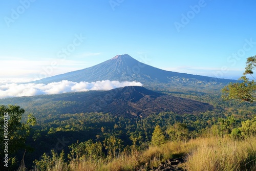 © LyceeChee, Fototapeta premium Majestic Twin Volcanic Peaks Rise Above Cloudscape