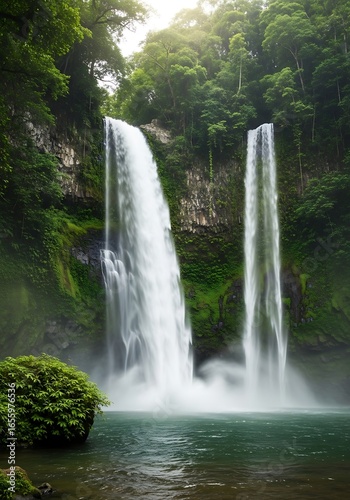 © Adelia, Fototapeta premium Majestic Twin Waterfalls Cascading Through Lush Green Rainforest.