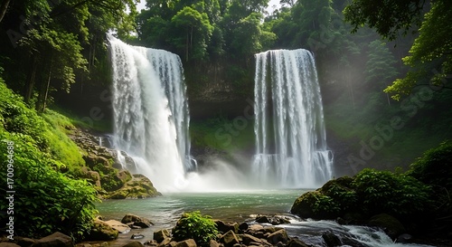 © Erin, Naklejka premium Majestic Twin Waterfalls in Lush Tropical Rainforest.