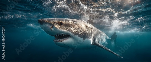 © YuLia, Naklejka premium Majestic Underwater Shot of a Great White Shark with Open Jaw in the Deep Ocean.