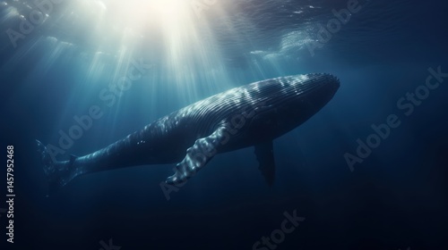 © berkah nikah, Fototapeta premium Majestic underwater whale bathed in sunlight.