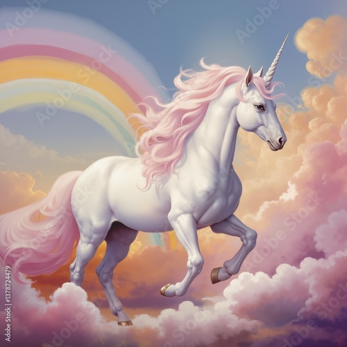 Fototapeta premium Majestic unicorn with pink mane running among pastel clouds under a rainbow for fairy tale book illustration, fantasy concept and decoration