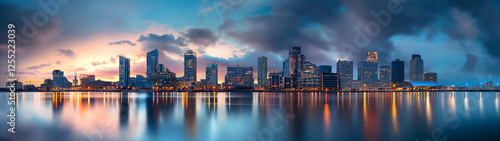 Fototapeta premium Majestic urban skyline reflecting on calm waters at sunset, perfect for cityscape wallpapers, real estate marketing, and travel promotions