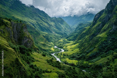 © Tanu, Fototapeta premium Majestic valley with lush greenery and winding river under cloudy skies in a remote location