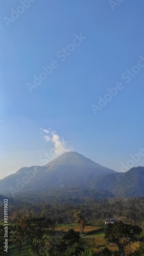 © Rifky Rachman Safri, Obraz premium Majestic view of Mount Penanggungan, a volcano in East Java, Indonesia, surrounded by lush greenery and clear blue skies