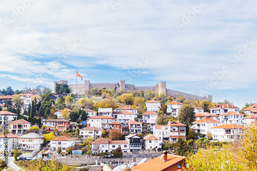 © mitarart, Fototapeta premium Majestic view of Samoil's Fortress, a historic fortification overlooking the picturesque town of Ohrid, North Macedonia.