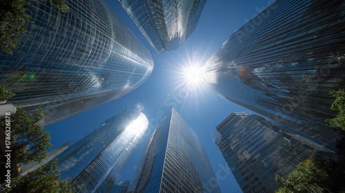© Ilmi, Naklejka premium Majestic View of Towering Skyscrapers with Lens Flare from Below Under Bright Sunlight