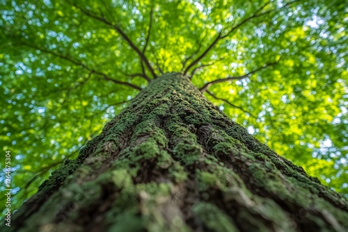 © D, Naklejka premium Majestic View Upwards Underneath a Vibrant Green Canopy of a Mossy Tree