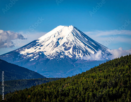 © Bayu, Fototapeta premium Majestic Villarrica Volcano - Snow-Capped Peak Rising Above Lush Green Forest, Chile.