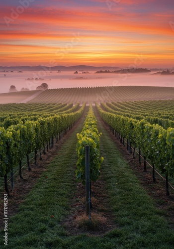 © IbragimovN, Fototapeta premium Majestic vineyard sunrise over rolling hills and lush vines in misty valley