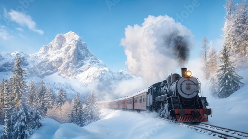 Obraz premium Majestic Vintage Steam Train Journeying Through a Snow-Covered Winter Landscape Surrounded by Tall Mountains and Frosty Pine Trees