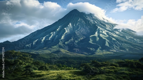 Naklejka premium Majestic Volcano Landscape. Snow-Capped Peak, Lush Green Valley, and Dramatic...
