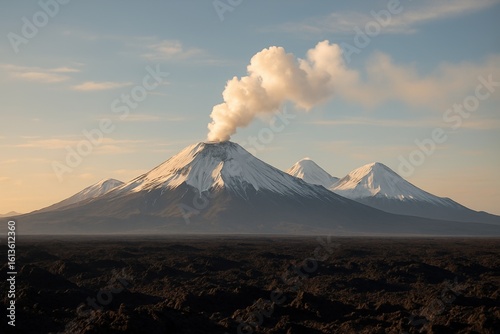 Fototapeta premium Majestic Volcano Landscape with Steam Plume and Snowy Peaks in South American Setting