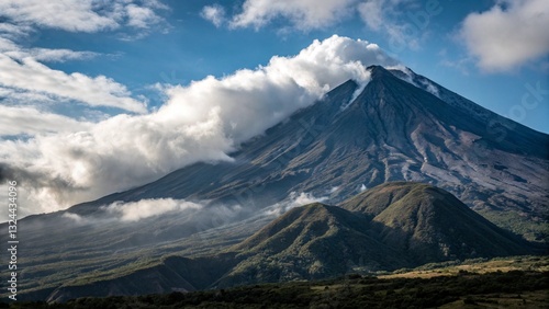 © Platon, Fototapeta premium Majestic volcano mountain against a dramatic sky, with clouds swirling around its summit. Perfect for illustrating natural wonders, geological formations, and breathtaking landscapes