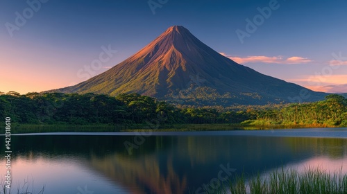 Fototapeta premium Majestic Volcano Reflected in Serene Lake at Dawn: A Breathtaking Tropical...