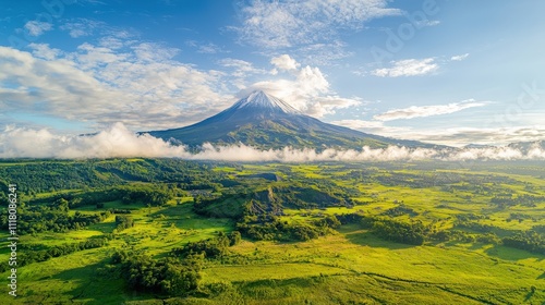 © UnderTheSun, Fototapeta premium Majestic volcano rises above lush green fields under a clear blue sky, surrounded by wispy clouds, showcasing nature's breathtaking beauty.