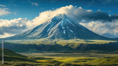 Fototapeta premium Majestic Volcano under a Cloudy Sky, A Breathtaking Landscape