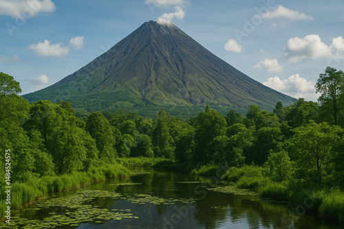 Fototapeta premium Majestic volcano with lush forest and a calm river under a partly cloudy sky