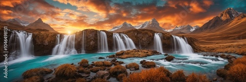 © Reazy Studio, Fototapeta premium Majestic Waterfall and Mountain Landscape at Sunset with Cloudy sky