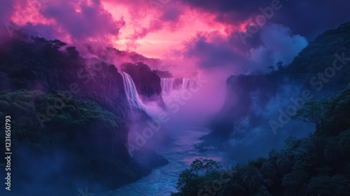 Obraz premium Majestic waterfall at sunset, lush rainforest, mist, vibrant colors, travel...