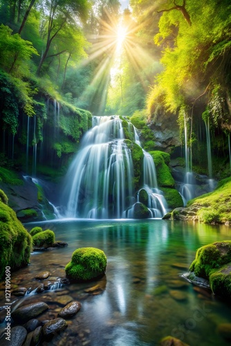 © Ferhaoui Ali, Obraz premium Majestic Waterfall Cascade: Moss-Covered Rocks, Crystal-Clear Pool, and Lush Forest – 10K Tranquil Beauty