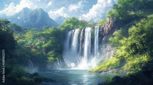 © addymawy, Fototapeta premium Majestic Waterfall Cascades Down Mountainside Into Lush Green Valley