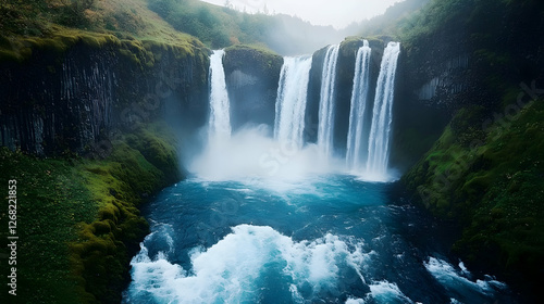 © Aurora Putri, Fototapeta premium Majestic waterfall cascades into turquoise pool, misty landscape
