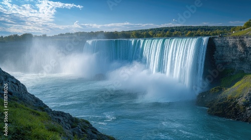 © uswatun, Fototapeta premium Majestic Waterfall Cascades into Turquoise Waters Under a Bright Sky