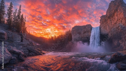 © CHAKKAPONG, Fototapeta premium Majestic waterfall cascading amidst colorful sunset yellowstone national park nature photography scenic landscape