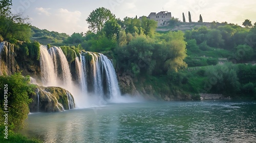 © MD, Obraz premium Majestic Waterfall Cascading Down a Lush Green Hill