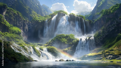 Fototapeta premium Majestic waterfall cascading down a lush green mountain in a tropical...