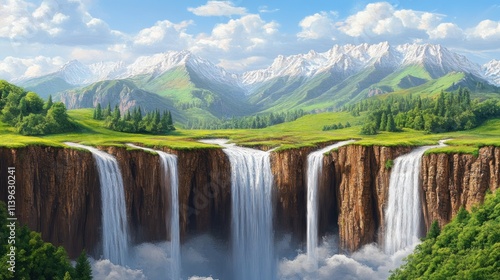 © Fandi Comp, Fototapeta premium Majestic waterfall cascading down cliffs into lush valley, snow-capped mountains backdrop.