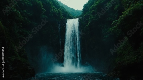 Naklejka premium Majestic Waterfall Cascading Down Lush Green Cliffs