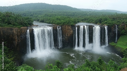 © Biancaart, Fototapeta premium Majestic Waterfall Cascading Down Lush Green Cliffs