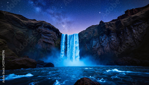 © Vasilina FC, Naklejka premium Majestic waterfall cascading down rocky cliffs at night